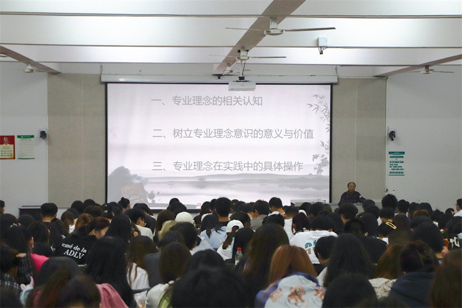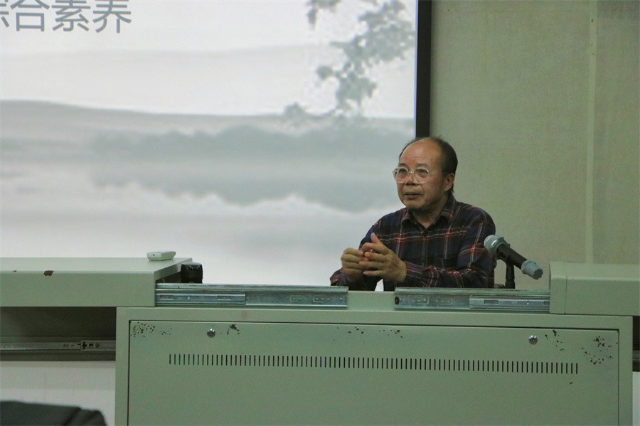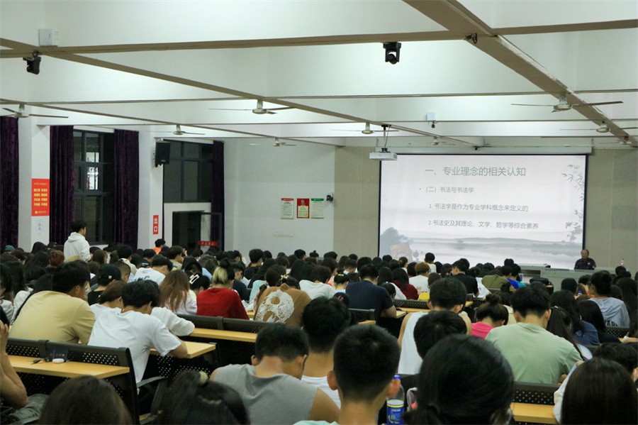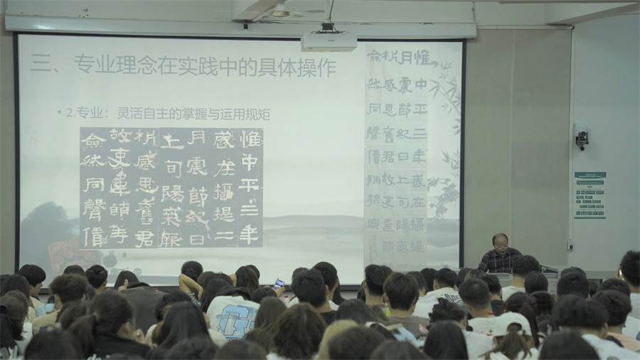 紧接着,黎东明教授以社会角色为中心,为大家讲解专业意识对专业选择的重要性。他以专业能力的发挥在文化艺术活动中的体现展开讲授,进而剖析专业理念在个人定位中的实现与社会给予的专业期待之间相互转换的关系。他以诸多书法家经历为背景,帮助同学们认清专业历史发展规律,“认清历史,才能认清现在;认清历史发展规律,才能加入到时代发展中去”。黎东明教授进一步结合专业理念,指出“发展个人就是发展学科”,大学生应该具备强烈的理念意识,凭借自身发展增强学科竞争力,以自身努力形成个体发展与专业学科点的良性循环。他还强调树立专业理念在社会活动中对个人社会角色的体现,以及专业理念在社会反映中至关重要的作用,帮助大家在认清专业的历史发展规律的同时,自觉成为时代发展洪流中的一员。