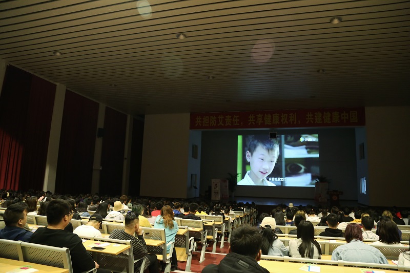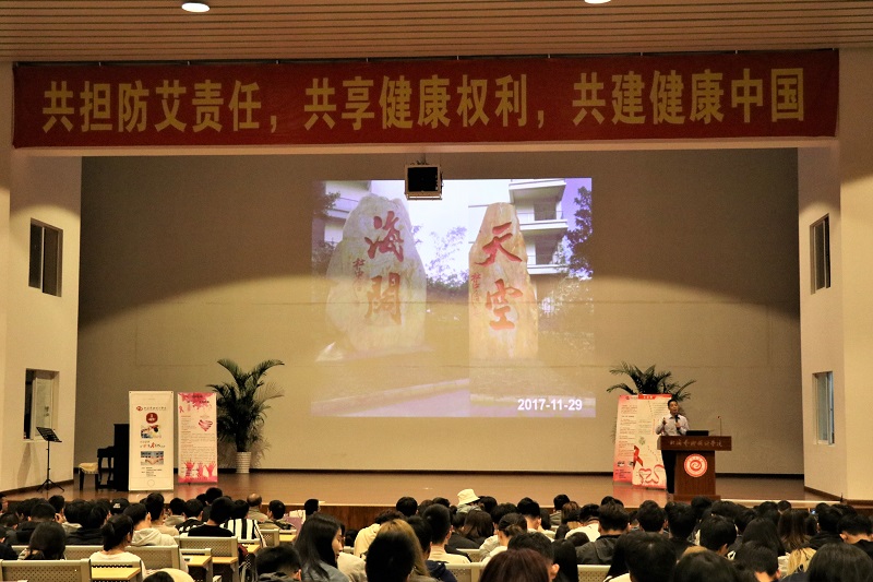 随后由北海市民间志愿者协会吕良勇博士进行预防艾滋病公益知识讲座。吕教授为我们详细介绍了艾滋病以及如何预防艾滋病。他指出艾滋病传播方式主要是血液,不良性行为,母婴和吸毒,并为我们播放了患艾滋病症状的图片,例举了一些艾滋病的案例,让学生们详细了解艾滋病感染、传播、预防等知识,号召大家关爱艾滋病患者。