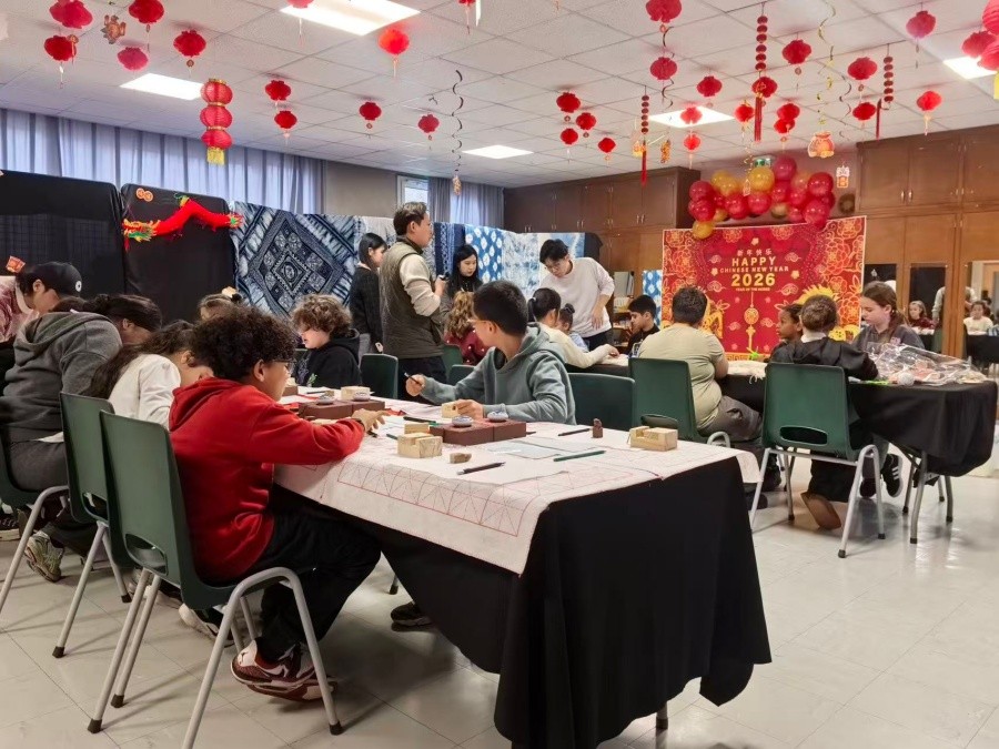 2月21日至22日,勒布朗梅尼尔市政府广场举办大型中国新年文化集市,我校团队打造的非遗展示专区成为集市焦点。团队通过现场演示、互动体验等方式,系统解读中国传统工艺的历史渊源与文化寓意,香云纱展示、手工技艺展演等特色项目吸引大批市民驻足参与,让中国文化在城市公共空间实现沉浸式传播。2月22日晚,中国春节庆祝晚会在当地剧场隆重上演,舞蹈学院带来的中国传统古典舞与当地华人音乐与艺术协会节目联袂呈现,700余名现场观众共同欣赏了这场融合中法文化元素的艺术盛宴,掌声与欢呼声贯穿全场,彰显了中国传统艺术的跨文化感染力。