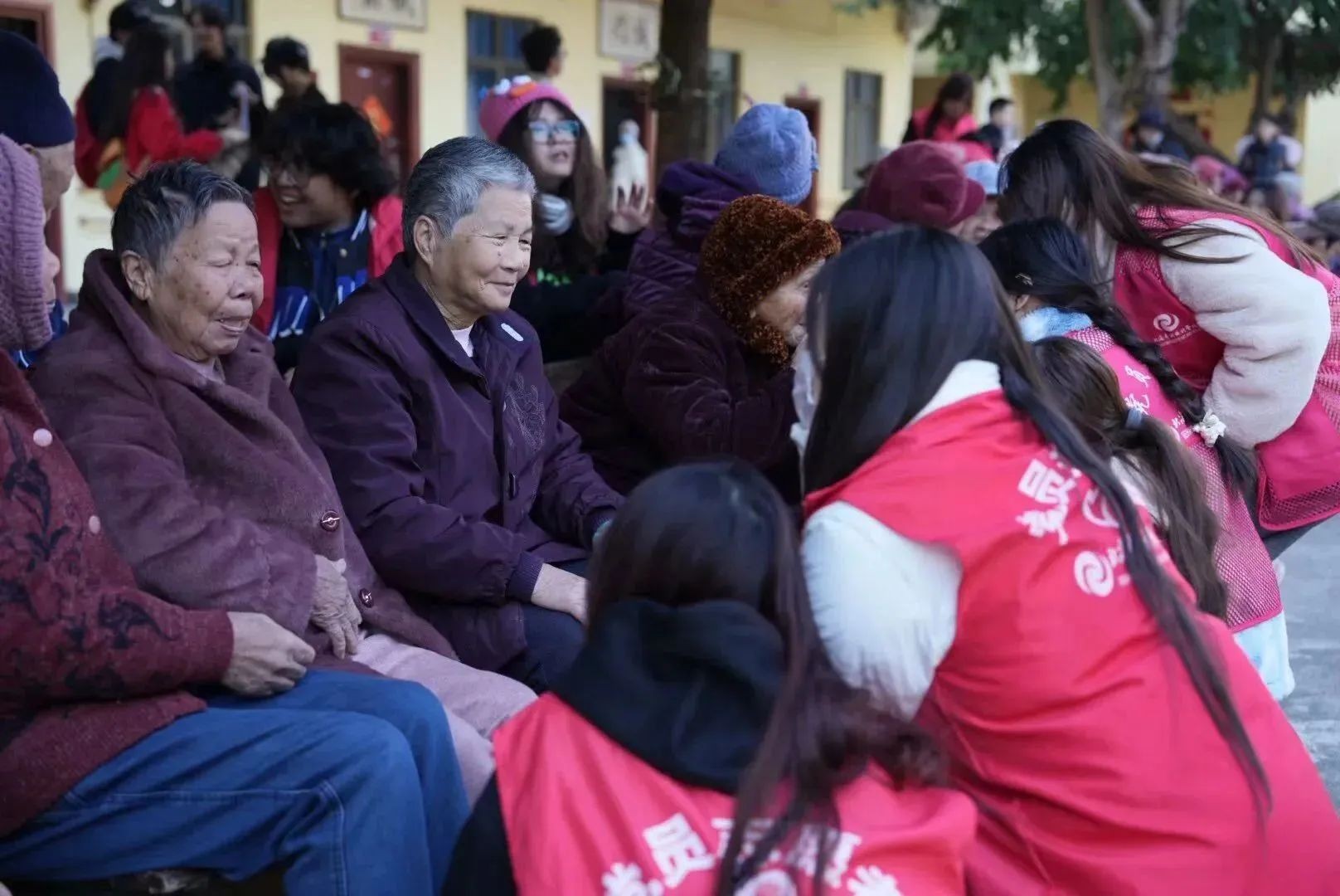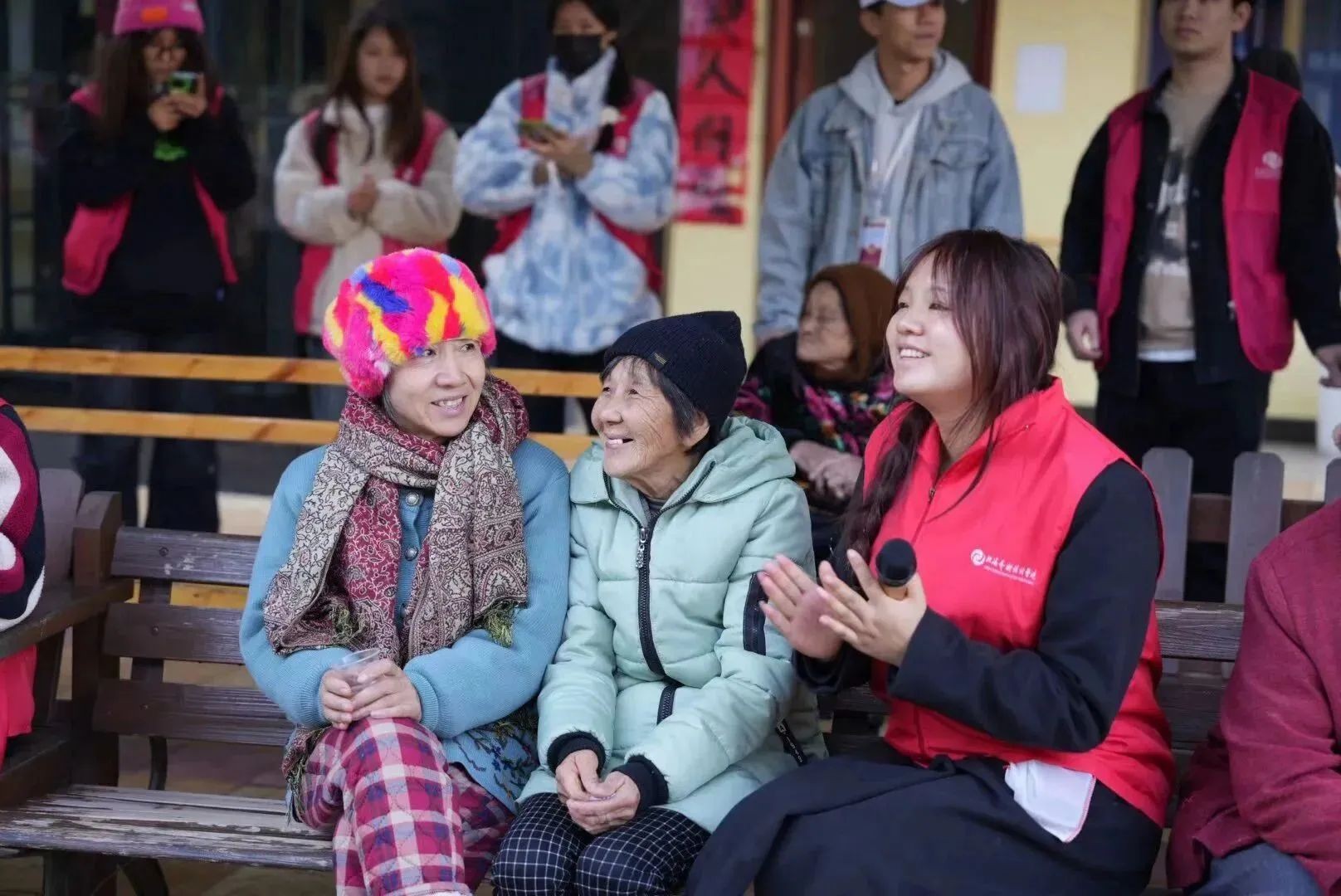 (志愿者与老人合影)