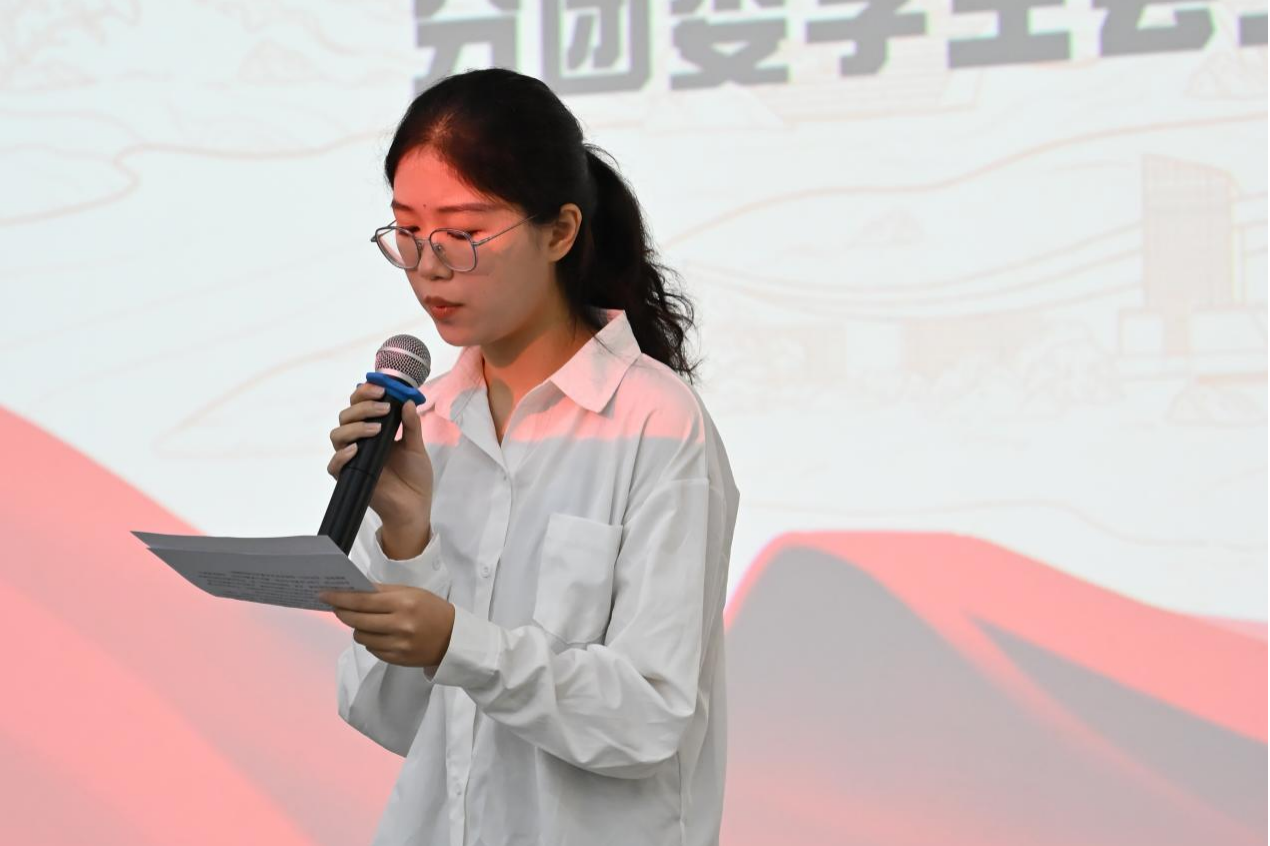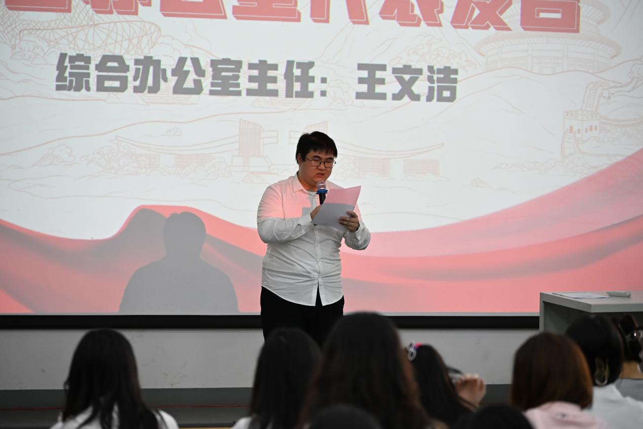 会议伊始,文学院党支部书记岳莹为大会致辞。岳书记首先对分团委成员在过去一年中的辛勤付出给予充分肯定。无论是迎新志愿活动中烈日下的执着坚守,还是团支部深入社区促进文化融合的不懈努力,亦或是积极参与学院各类展览与会议的忙碌身影,成员们的辛勤付出始终清晰可见。她指出,要切实做好“老带新”工作,将宝贵的工作经验传授给新加入的干事,以助力他们更快、更好地融入分团委的工作环境。同时,希望成员们珍视分团委这一平台,把握宝贵机会,持续提升个人能力,展现文学院学子的青春风采 。
