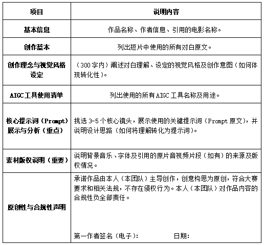 5.投稿内容:提交MP4视频文件及PDF格式的《AIGC创作说明与提示词报告》(模板见附件2)。