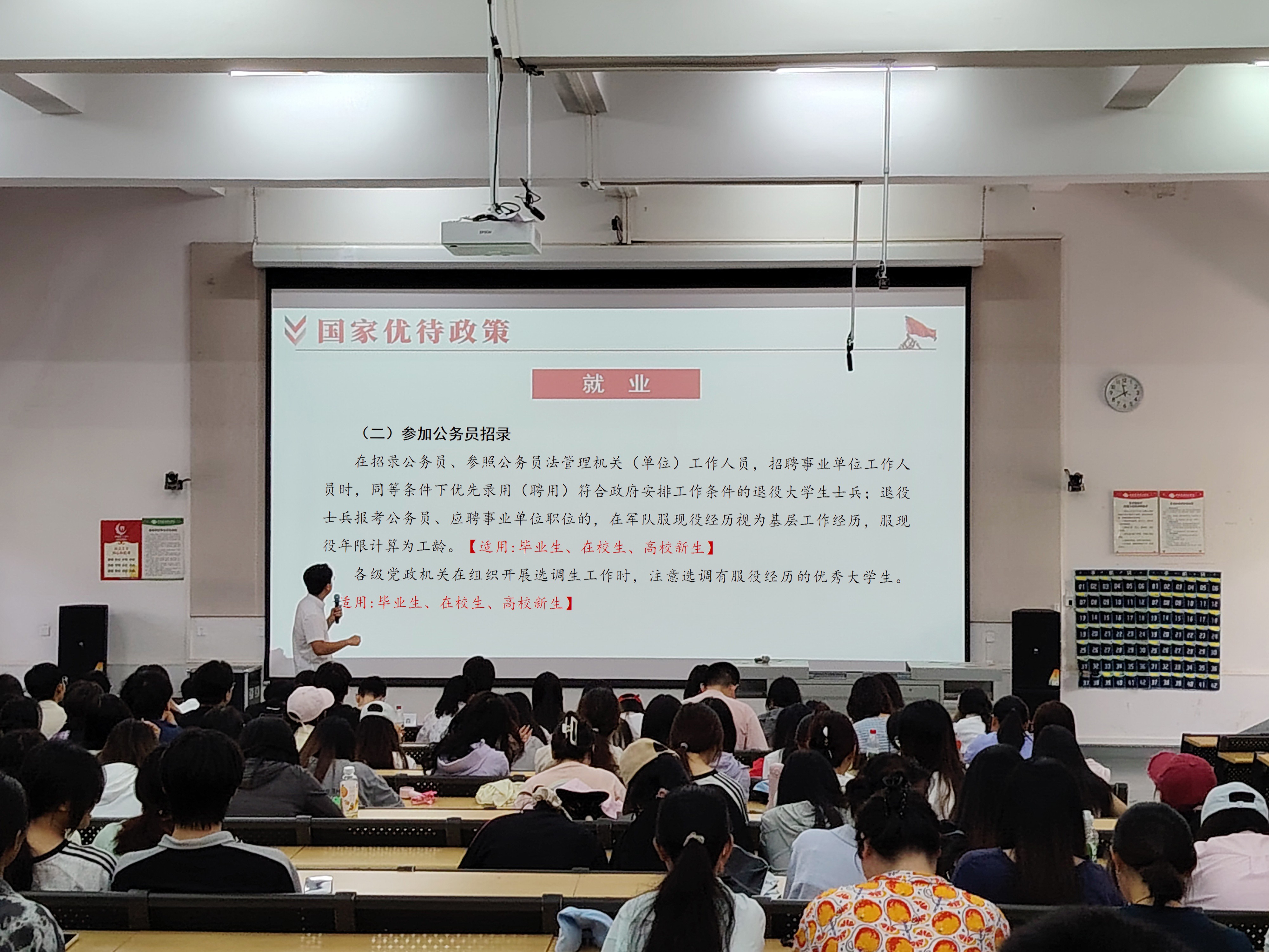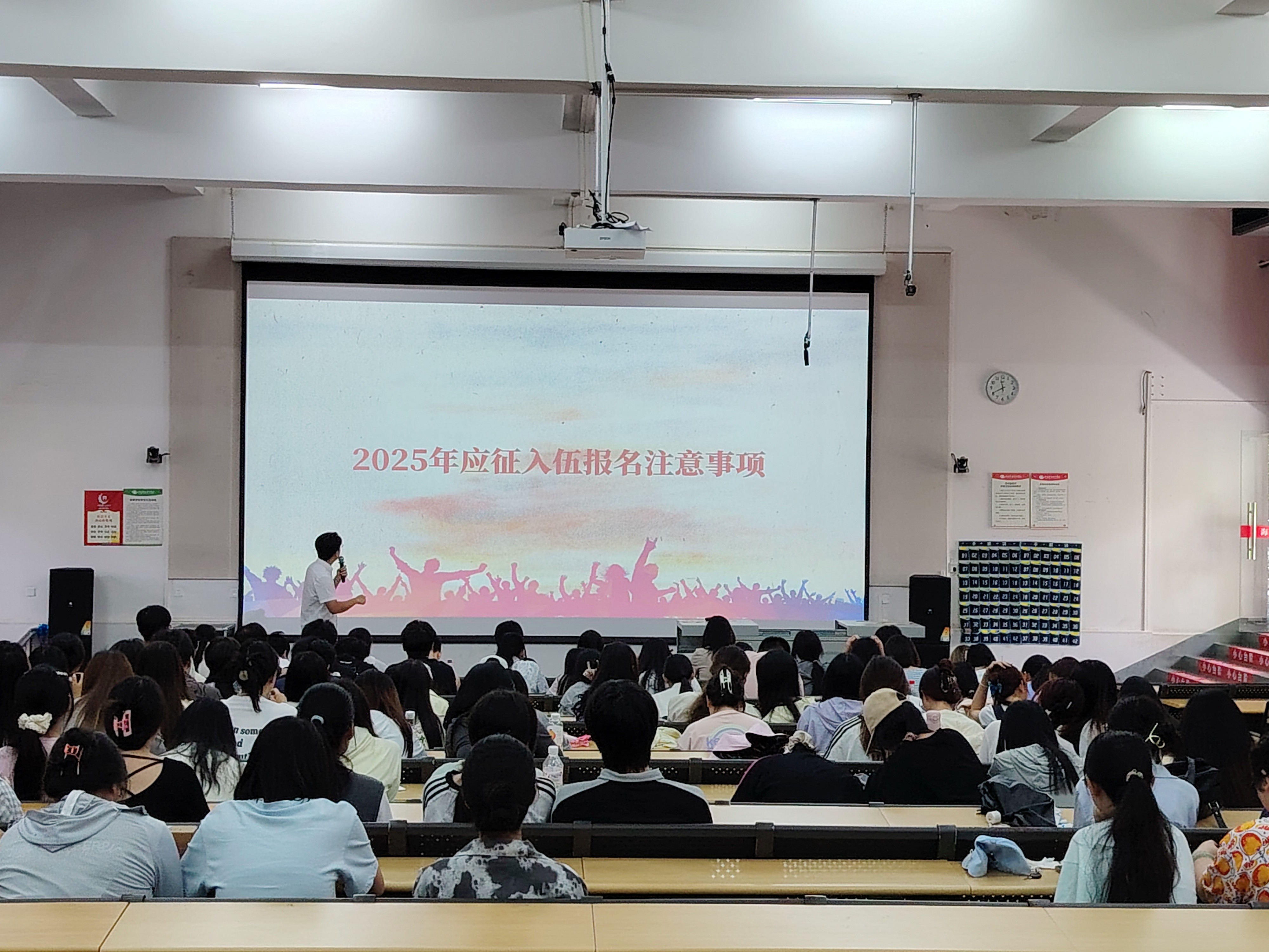 学生管理方面内容主要由学院副院长裴景旺进行主讲。裴副院长对学生叮嘱了三件事情:一是师生协力做好离校工作,强调学生归还图书、公共物资等离校手续的办理时限,以及宿舍实行“三无标准”验收的要求;二是细化上京求学安排;三是开展征兵动员、就业创业宣传,通过政治、成长、经济“三笔账”分析入伍优势。现场通过播放征兵入伍宣传视频,有效激发了同学们的报国热情。就业创业是当代青年实现人生价值的重要途径。裴景旺副院长以当前经济结构调整带来的就业创业机遇,建议文学院学子结合自身专业背景,重点关注数字经济、绿色经济等新兴领域。