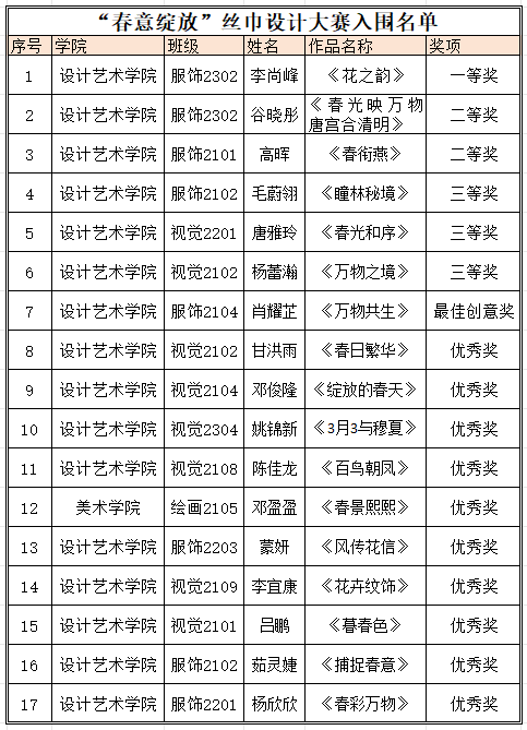 此次大赛以“万物维境”为主题“春光”与“万物”以纺织品丝巾图案设计的形式呈现吸引了众多学生积极参与大赛邀请了外聘教授张树新原清华大学教授博士生导师)、徐雯原北京服装学院教授北服博物馆馆长),设计艺术学院副院长白建强副院长赵明服装设计教研室主任廖汀作为大赛评委全部参赛设计作品打印成丝巾成品进行评选经过严格的评审最终从200余件参赛作品中评选出17个获奖作品其中优秀奖10三等奖3二等奖2,一等奖一名最佳创意奖一名