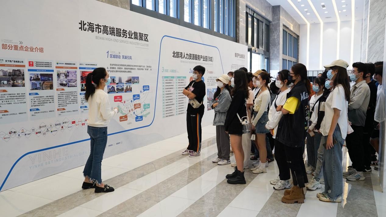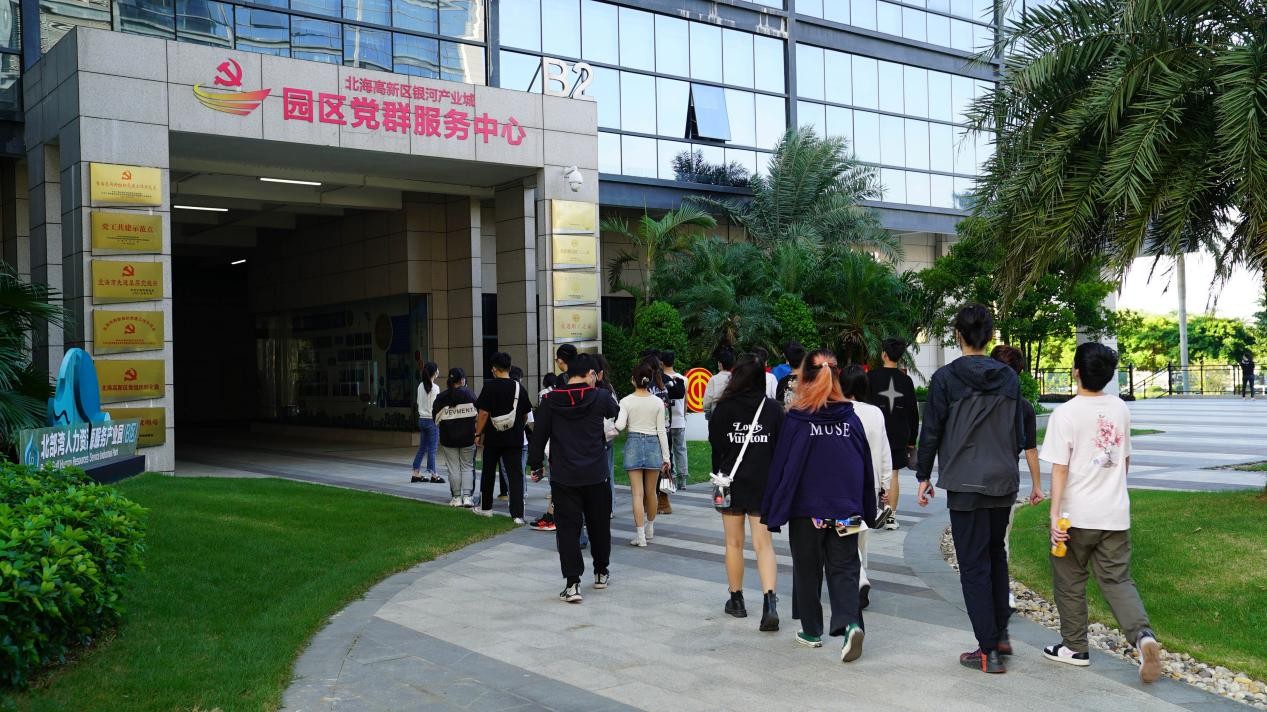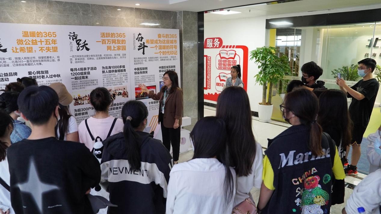 园区负责人梁张月带领师生进行参观,通过讲解介绍园区的企业文化、办公环境、就业政策、园区配套等情况,并实地参观北海365、卓美文化、纽博生物等部分企业。