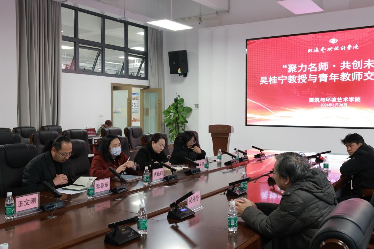 北海艺术设计学院建筑与环境艺术学院于2024年1月26日16:30在艺德楼805举行了“聚力名师·共创未来”吴桂宁教授与青年教师交流座谈会。座谈会由建筑与环境艺术学院副院长张春东主持。