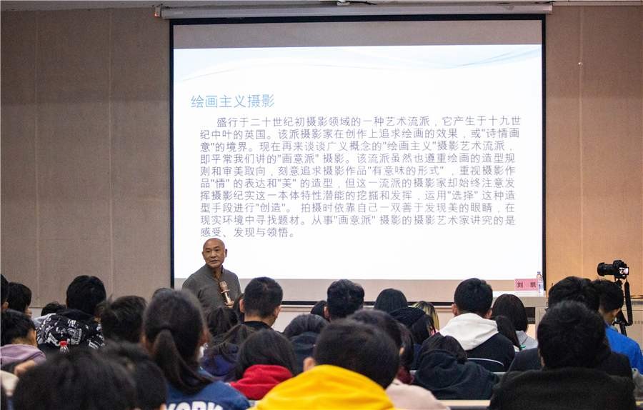刘教授介绍到,摄影可以分为人像摄影、风光摄影、人文摄影、新闻摄影、商业摄影、特殊摄影、艺术创作摄影、生态摄影等八类,但无论哪一类摄影,重要的是要体现出摄影者的思想深度。因此,同学们不仅要学习摄影专业知识,更要用镜头去体验社会、感悟人生。