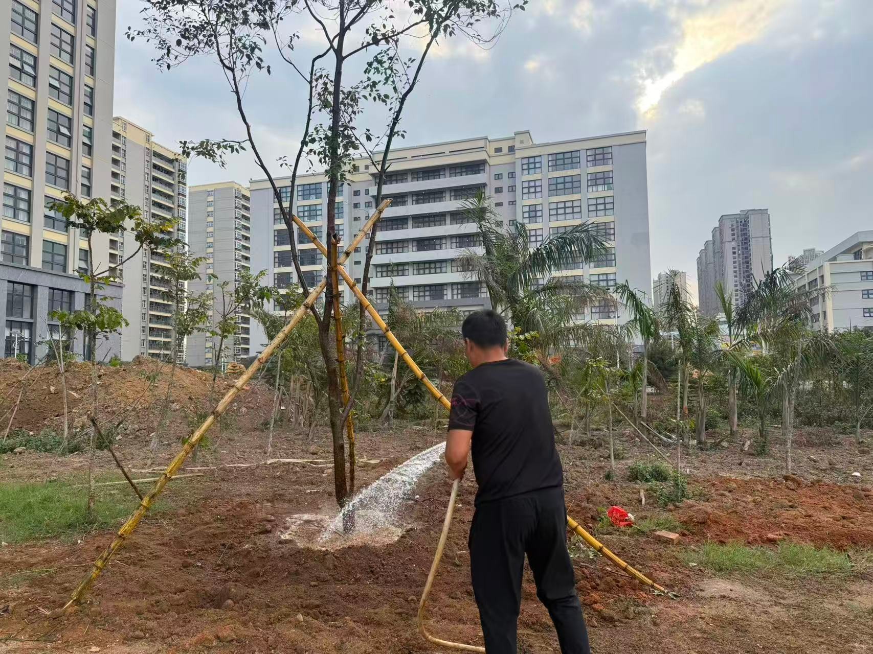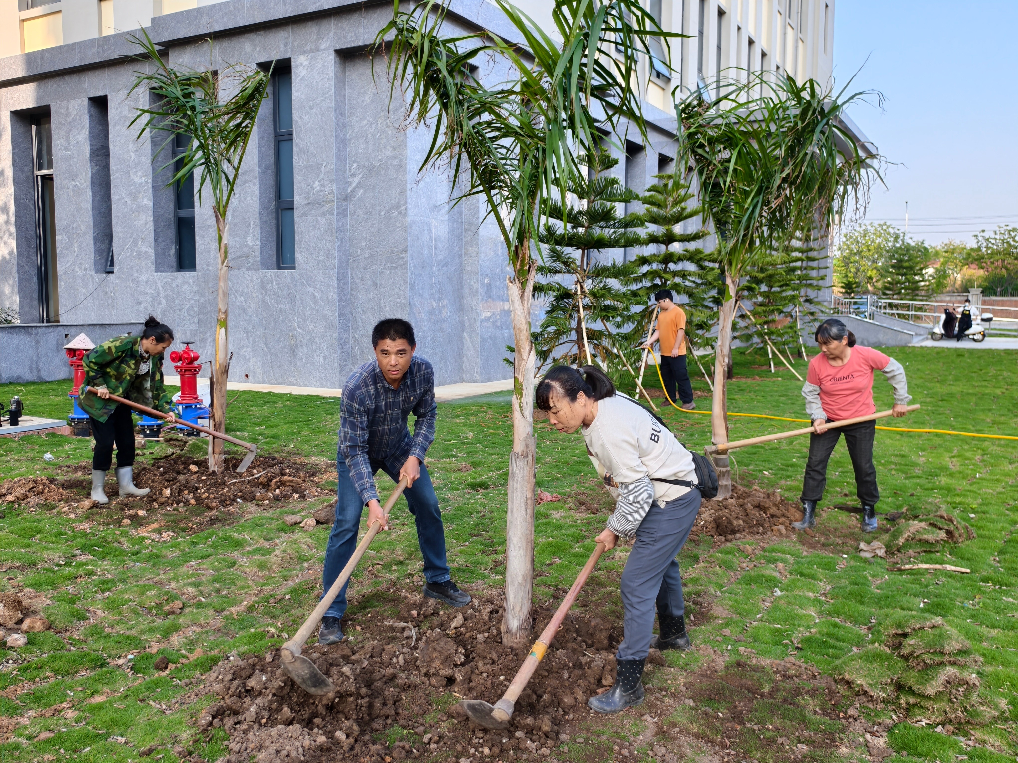 经过一下午的辛勤劳作,22棵香樟树、10株榕树、8棵大皇椰、32株散尾葵迎风挺立、错落有致,在午后阳光下焕发出勃勃生机。香樟树形雄伟、四季常青;榕树枝繁叶茂、冠盖如伞;大皇椰挺拔秀丽、富有热带风情;散尾葵姿态潇洒、叶色翠绿。多种苗木的搭配种植,进一步丰富了南区绿化的层次感和景观效果,为师生营造更加优美宜人的校园环境。