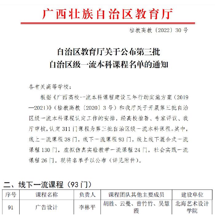 近日,根据《自治区教育厅关于公布第三批自治区级一流本科课程名单的通知》(桂教高教〔2022〕30号),我院李林平负责的 《广告设计》课程认定为自治区级线下一流本科课程。