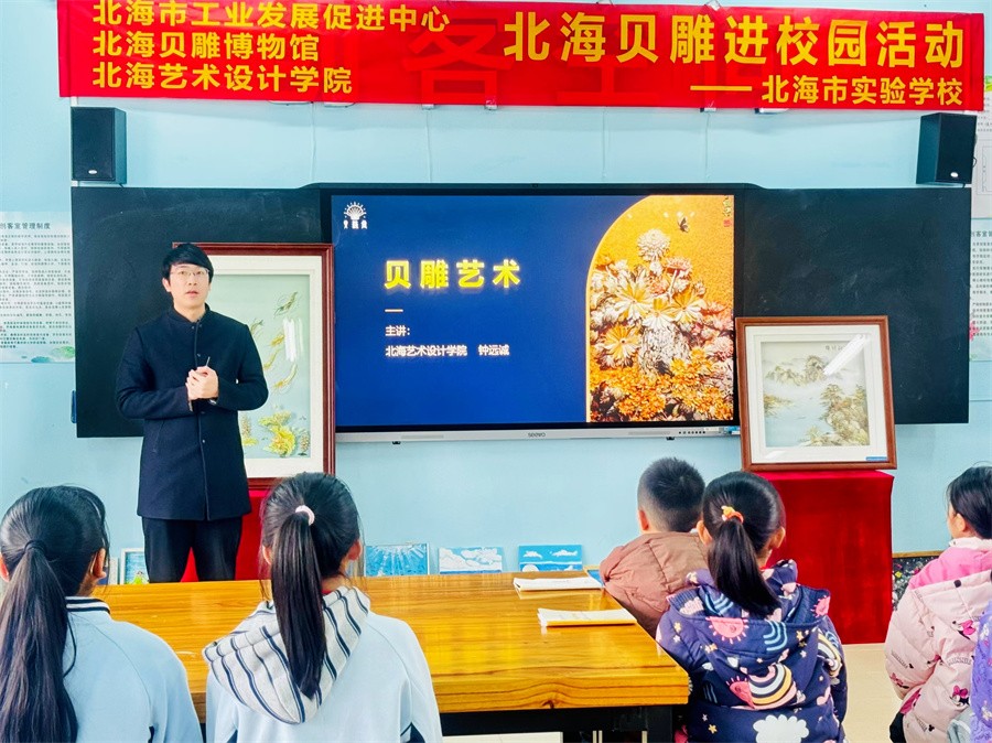 为进一步弘扬中华优秀传统文化,传承非遗技艺,由北海市工业发展中心、北海贝雕博物馆、北海艺术设计学院主办的“北海贝雕进校园”活动于3月7日下午在北海市实验学校顺利开展。我校设计艺术学院产品设计专业教师钟远诚带领四名2023级学子积极参与,为这场文化传承与创新活动添砖加瓦,贡献力量。