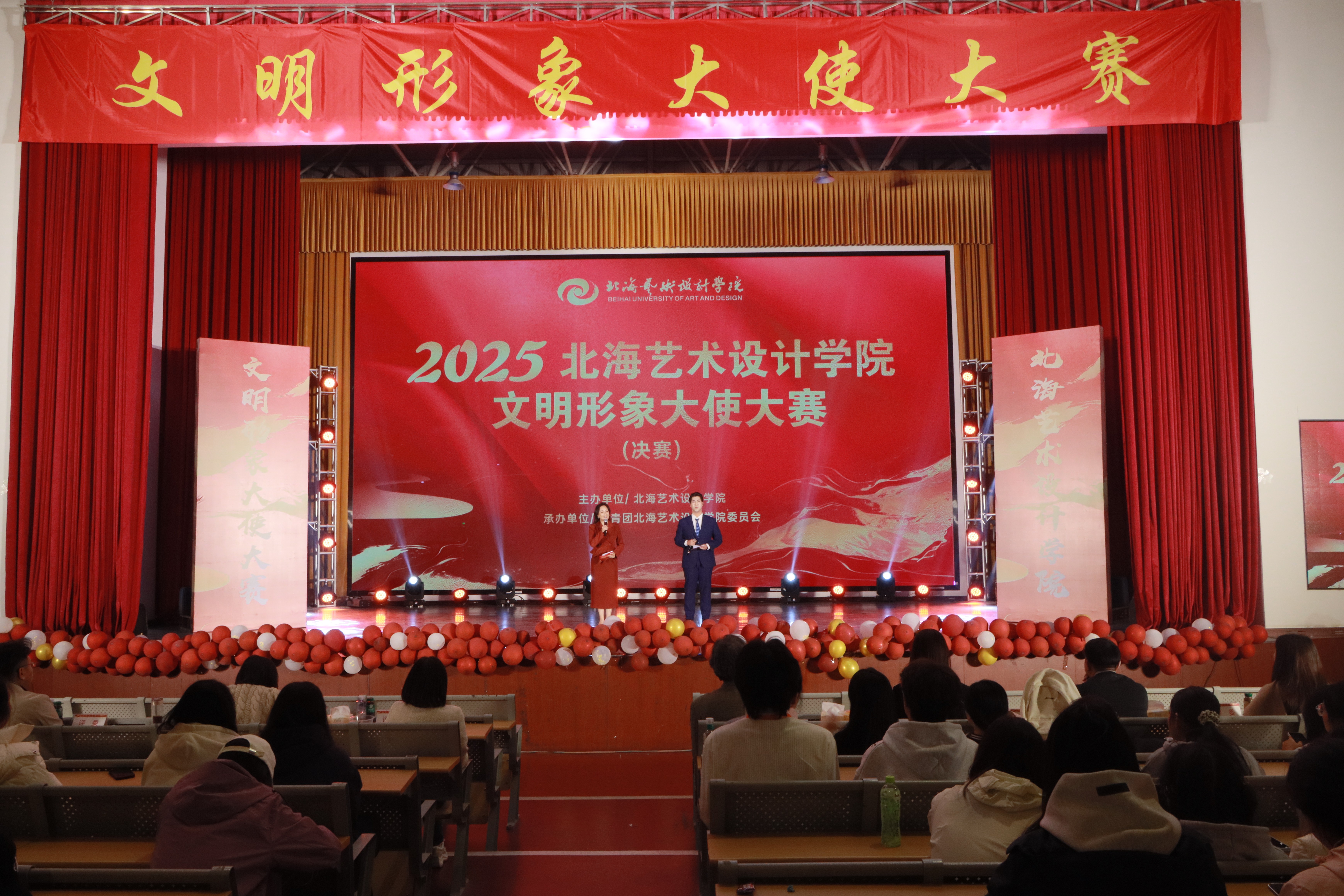 为充分发挥榜样示范引领作用,深入培育和践行社会主义核心价值观,选拔校园文明建设代言人,2025年12月26日,北海艺术设计学院文明形象大使决赛在该校西校区大礼堂举行。广西艺术学院舞蹈学院副院长白洁、广西艺术学院党办院办发展规划处规划科科长郑靖、北海艺术设计学院校长卢新华等十余位行业专家及高校领导担任评委,共同见证校园文明风采的集中展现。